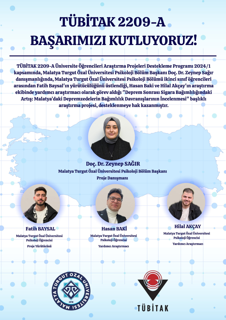 Bölümümüzün ilk öğrencilerinden Fatih BAYSAL, Hasan BAKİ, Hilal AKÇAY’ın “Deprem Sonrası Sigara Bağımlılığındaki Artış: Malatya’daki Depremzedelerin Bağımlılık Davranışlarının İncelenmesi” ve Efsa YÜCEL’in “2023 Yılında Ataması Yapılmayan Öğretmenlerin Gelecek Kaygılarına Yönelik Düşüncelerinin Değerlendirilmesi” adlı projeleri TÜBİTAK tarafından desteklenmeye hak kazanmıştır.