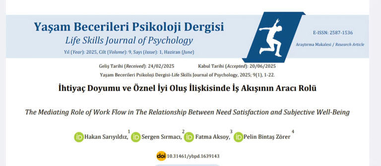 Araştırma Görevlimiz Hakan Sarıyıldız'ın "İhtiyaç Doyumu ve Öznel İyi Oluş İlişkisinde İş Akışının Aracı Rolü" başlıklı çalışması Yaşam Becerileri Psikoloji Dergisi'nde yayınlandı.