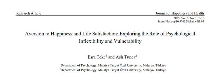 Öğretim elemanlarımızdan Dr. Öğr. Üyesi Esra TEKE ve Dr. Öğr. Üyesi Aslı TUNCA'nın ortak yazarları olduğu "Aversion to Happiness and Life Satisfaction: Exploring the Role of Psychological Inflexibility and Vulnerability" adlı makaleleri Journal of Happiness and Health dergisinde yayınlandı.