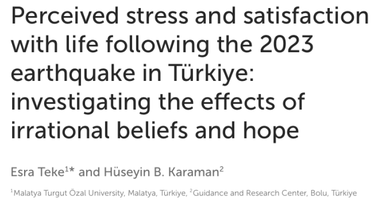 Öğretim elemanlarımızdan Dr. Öğr. Üyesi Esra TEKE’nin sorumlu yazarı olduğu “Perceived Stress and Satisfaction with Life Following the 2023 Earthquake in Türkiye: Investigating the Effects of Irrational Beliefs and Hope” başlıklı makale, Q1 kategorisindeki Frontiers in Psychology dergisinde yayınlandı.